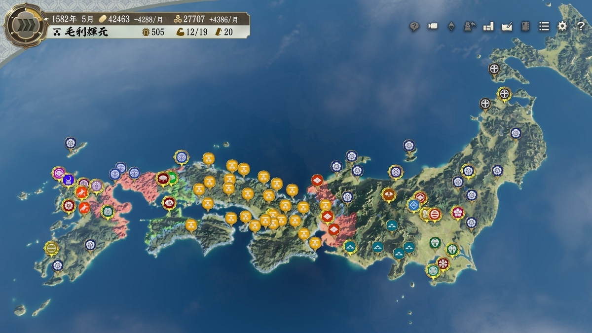 強敵の織田家も、領地が細長いせいで充分に兵を結集できず、数の暴力な毛利家には対抗しきれません。